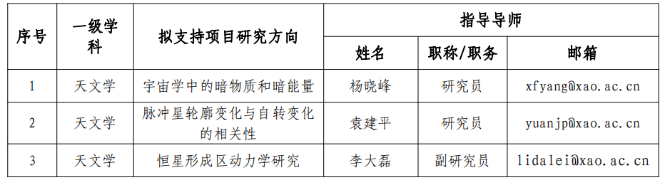 中科院新疆天文台现开展2022年大学生“科创计划”项目申报工作,“科创计划”项目指南详见下表。在校大学生可根据自己的专业兴趣,选择相应项目和指导教师(在申请学生本校可设共同指导教师)。有意向的学生在与项目指导教师充分沟通后,登录凯发k8大学科教结合协同育人行动计划( ),选择“科创计划”进行注册,然后在网上进行项目填报,请注意随时保存信息。全部填报完毕并确认无误后,点击提交,下载并打印申请表,请学籍所在学校(或学院)签字盖章后寄至项目设立导师,导师签字同意后交天文台研究生部。