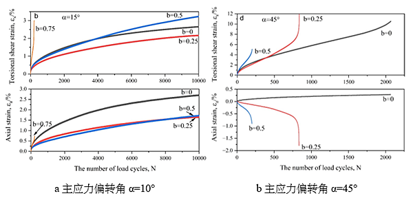 图2 不同中主应力系数下轴向与扭转剪切向应变随循环加载次数的变化