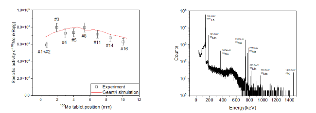 图:(左)钼-99产额实验值与理论值对比;(右)钼-99产品伽马能谱测量结果。(图/林木)